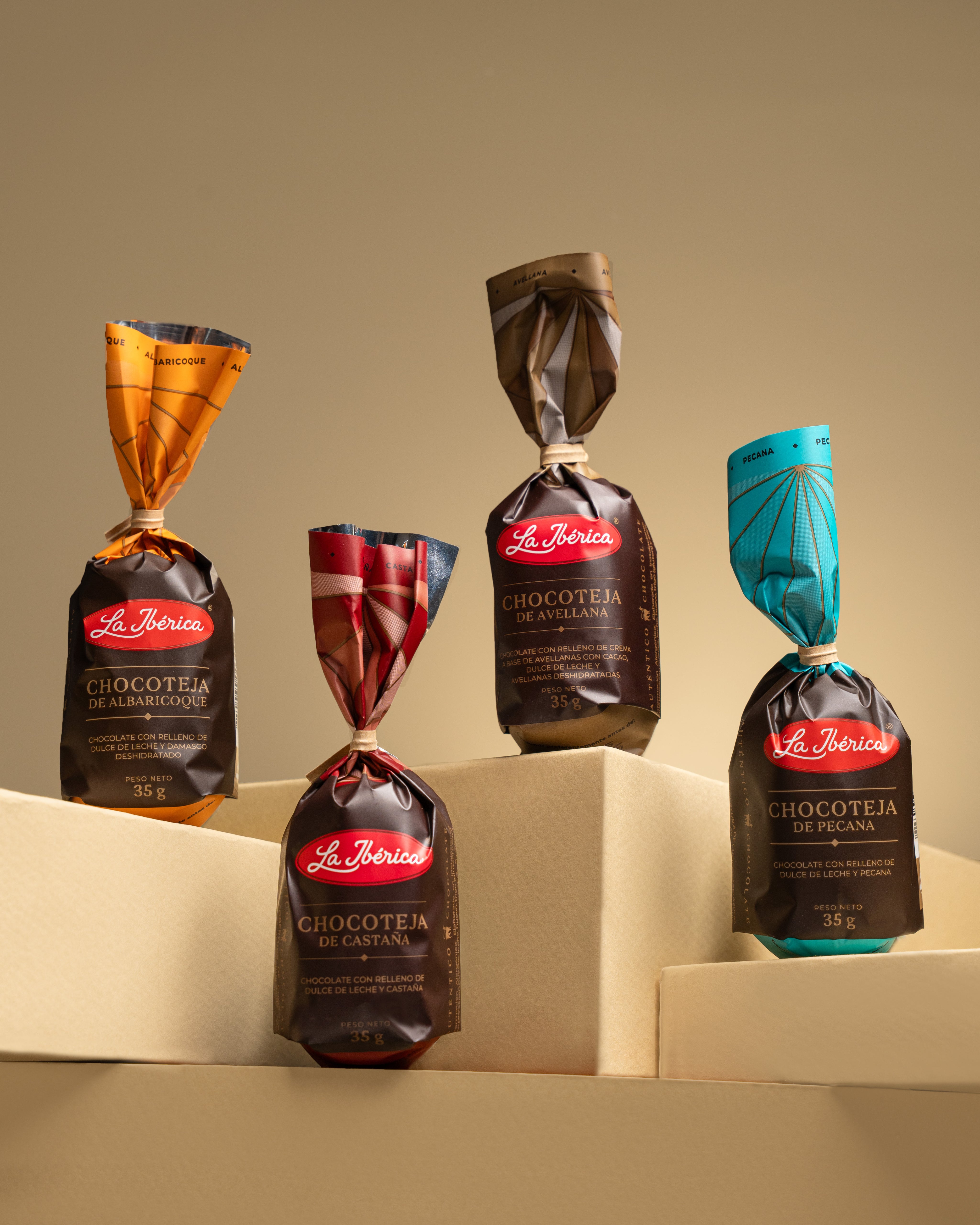Chocotejas surtidas: con relleno de dulce de leche y pecana o dulce de leche y damasco deshidratado.